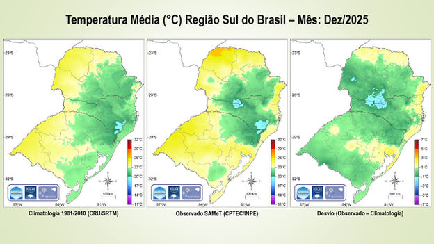 Boletim Climático Mensal da Região Sul do Brasil, desenvolvido pela Divisao de Climatologia Polar e Subtropical do Centro Polar e Climático e do NOTOS - Laboratório de Climatologia do departamento de Geografia da UFRGS, apresenta apresenta as condições observadas de precipitação e temperaturas (mínimas, médias e máximas) no mês de Dezembro de 2025.